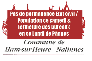 Nous vous rappelons qu'en raison de la Fête de Pâques, le service Etat civil / Population ne tiendra pas sa permanence du samedi matin (4 avril 2026). Lundi, le 6 avril 2026, c'est l'ensemble des services communaux qui ne seront pas accessibles en raison du jour férié. Nous vous retrouverons avec plaisir dès le mardi 7 avril 2026 à 9h. Nous vous souhaitons un très bon long week-end ! (Lire la suite)