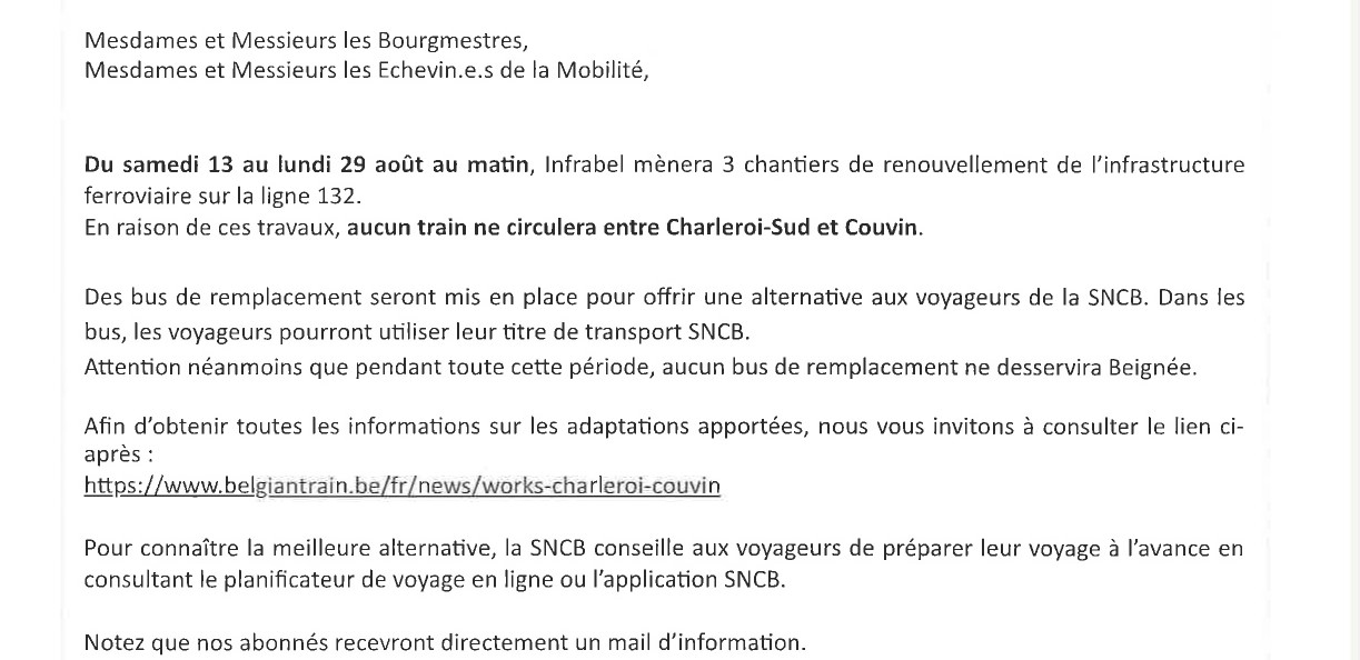 ATTENTION : pas de train entre Charleroi-Sud et Couvin entre le 13 et le 29 août. Des bus de remplacement sont prévus sauf pour Beignée