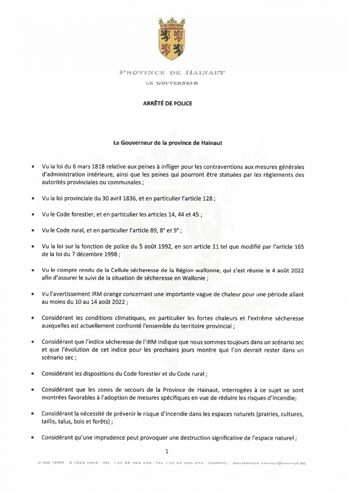Un nouvel Arrêté de police a été pris cet après-midi par le Gouverneur de la Province de Hainaut, M. Tommy Leclercq. Il abroge et remplace le précédent. Veuillez en prendre connaissance :