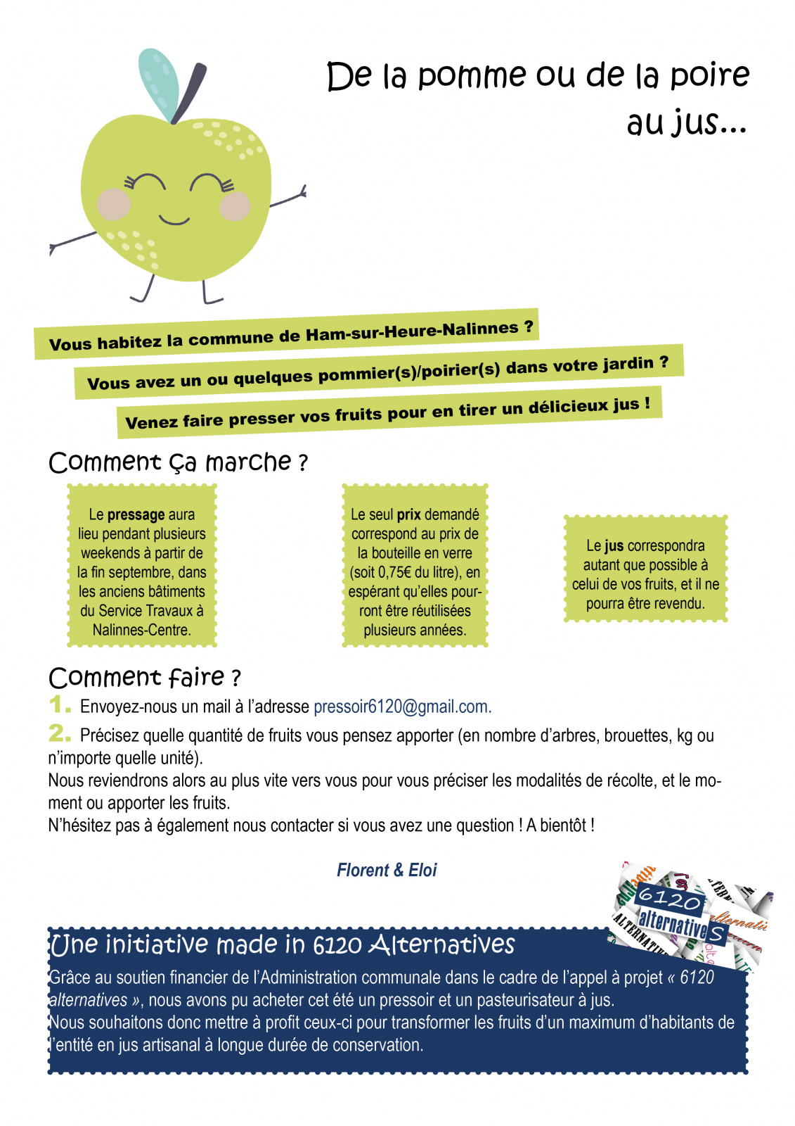 Si vous possédez des fruits à presser dans votre jardin/verger, n'hésitez pas à prendre contact avec Florent et Eloi (coordonnées ci-dessous), vous pourrez ainsi repartir avec votre jus...