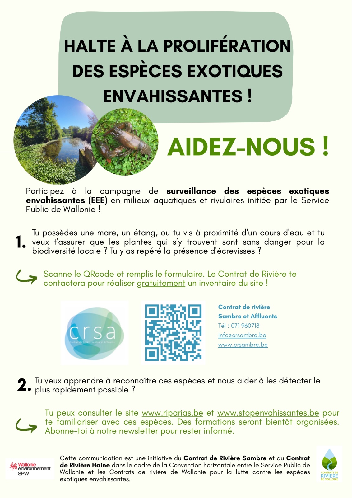 • L'autre vise à sensibiliser, informer et conseiller les citoyens à propos des espéces exotiques envahissantes (espèces animales ou végétales dont la présence dans notre écosystème en perturbe l’équilibre, créant des nuisances qui se répercutent sur notre société, notre écologie mais aussi notre économie.Certaines espèces ont été introduites délibérément, d’autres accidentellement.) ===> plus d'infos ici : https://www.crsambre.be/la-lutte-contre-les-especes-exotiques-envahissantes/