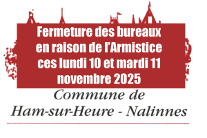 Petit rappel : En raison de la fête de l'Armistice, les bureaux de l'Administration communale ne seront pas accessibles ces lundi 10 et mardi 11 novembre 2025.  De plus, il n' y aura pas de permanence Etat civil / Population ce samedi 8 novembre 2025 au matin.  Nous vous retrouverons avec plaisir dès le mercredi 12 novembre à 9h.  (Lire la suite)