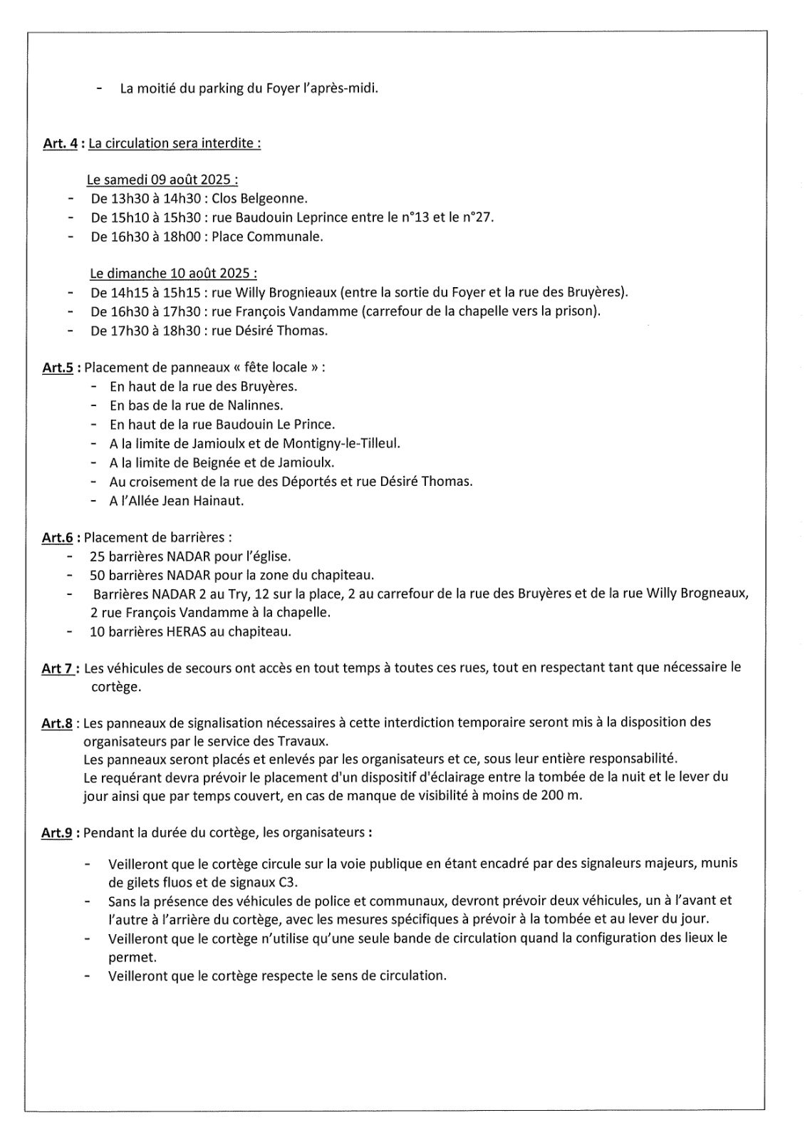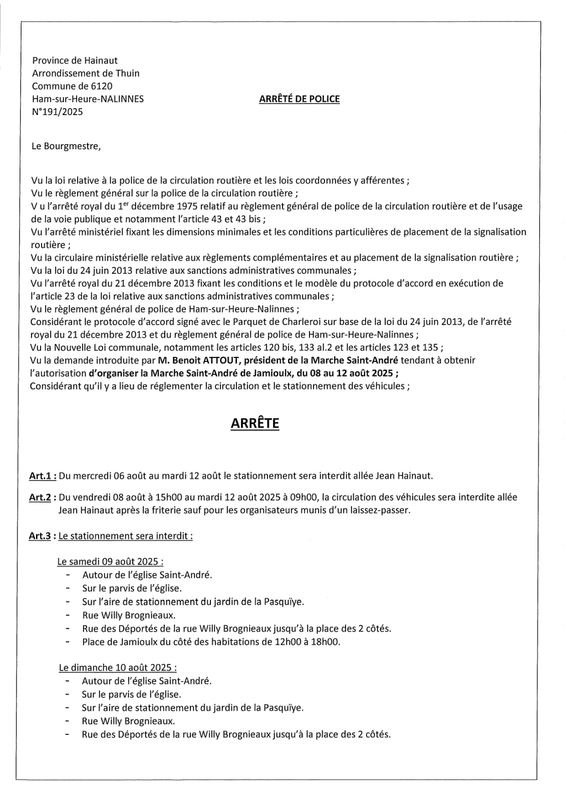 Arrêté de police de la Marche Saint-André de Jamioulx
