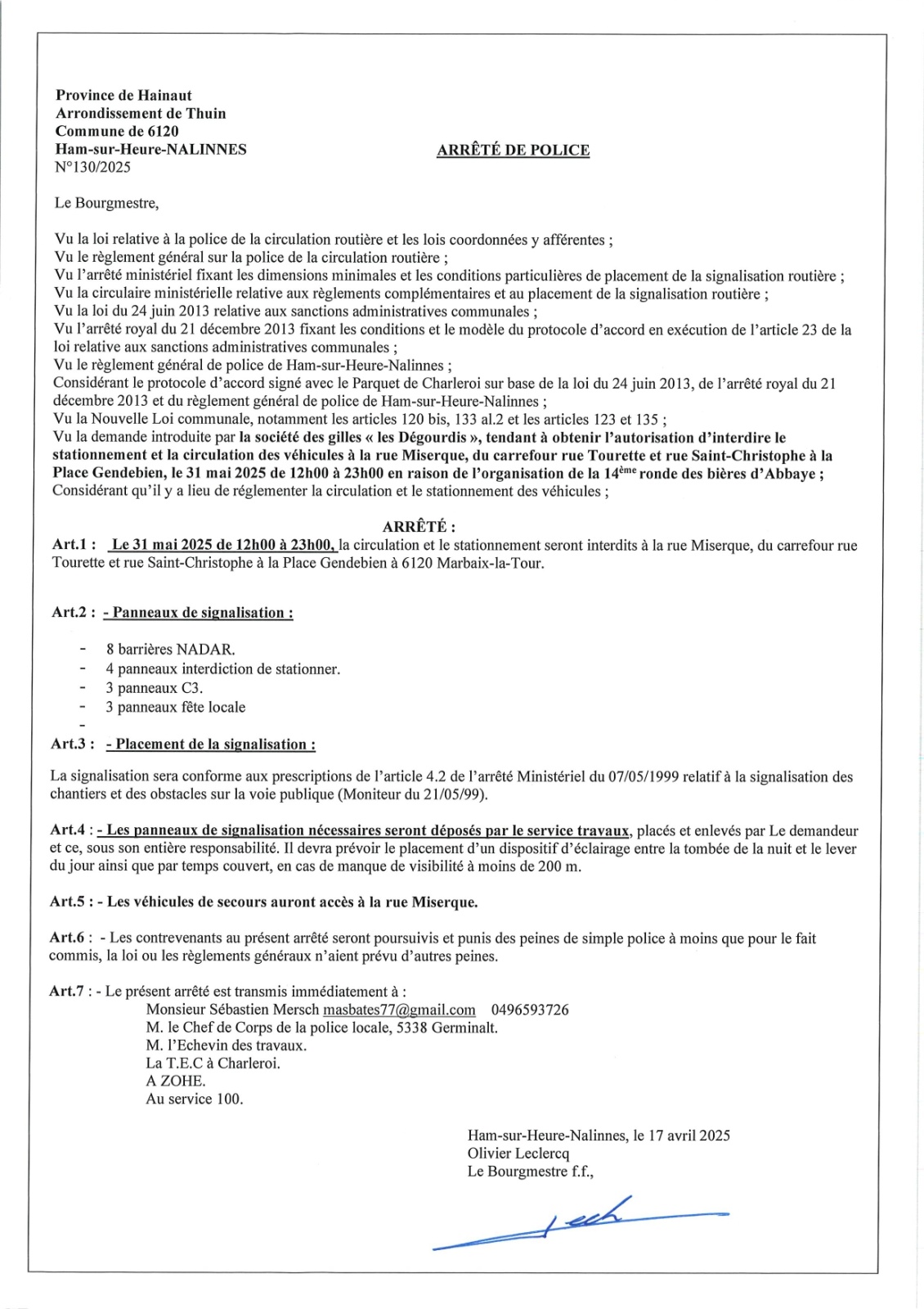 Arrêté de police relatif à l'événement "La Ronde des bières" à Marbaix-la-Tour le 31 mai 2025