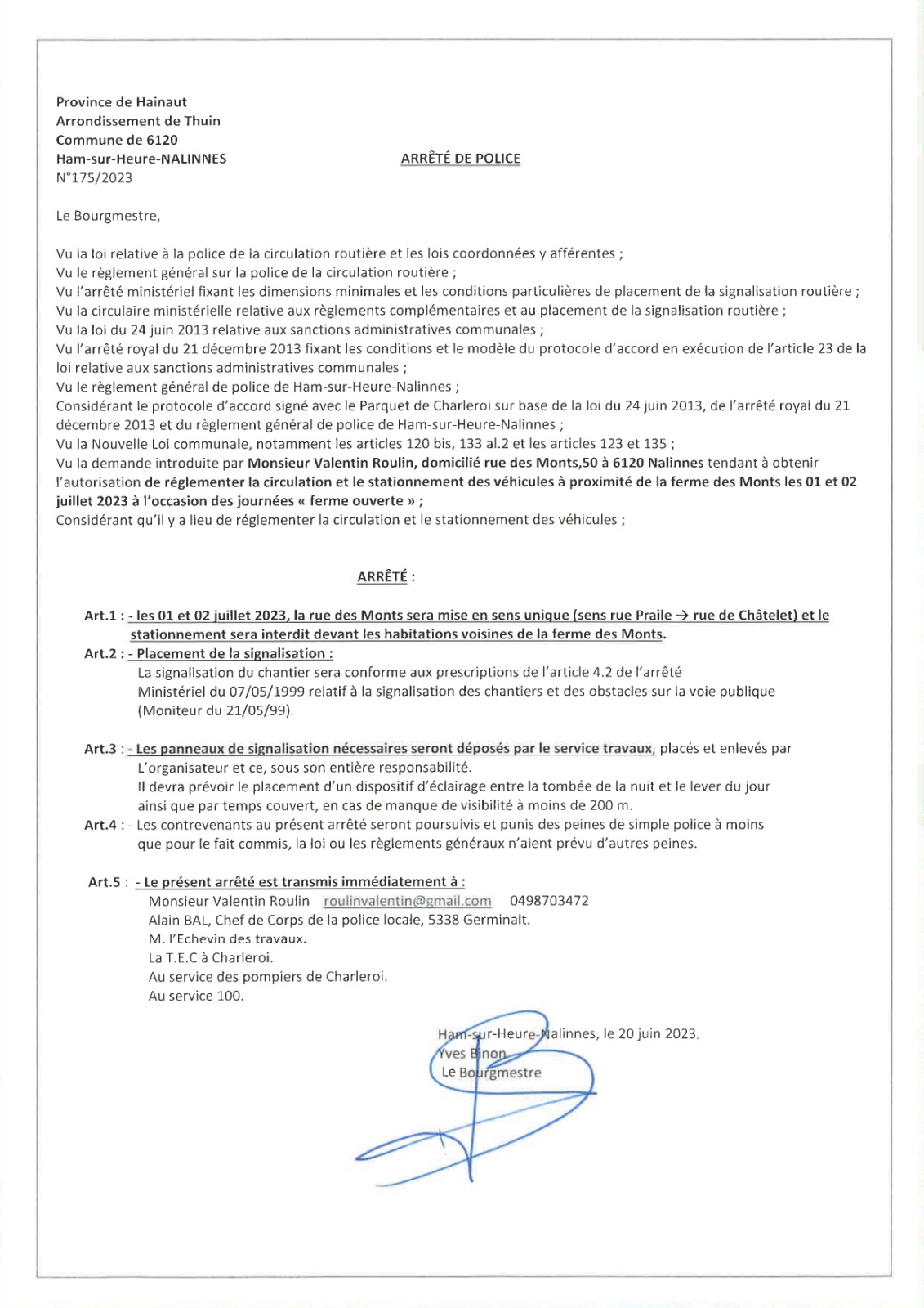 Arrêté de police relatif à l'organisation des Journées Ferme Ouverte - Rue des Monts à Nalinnes