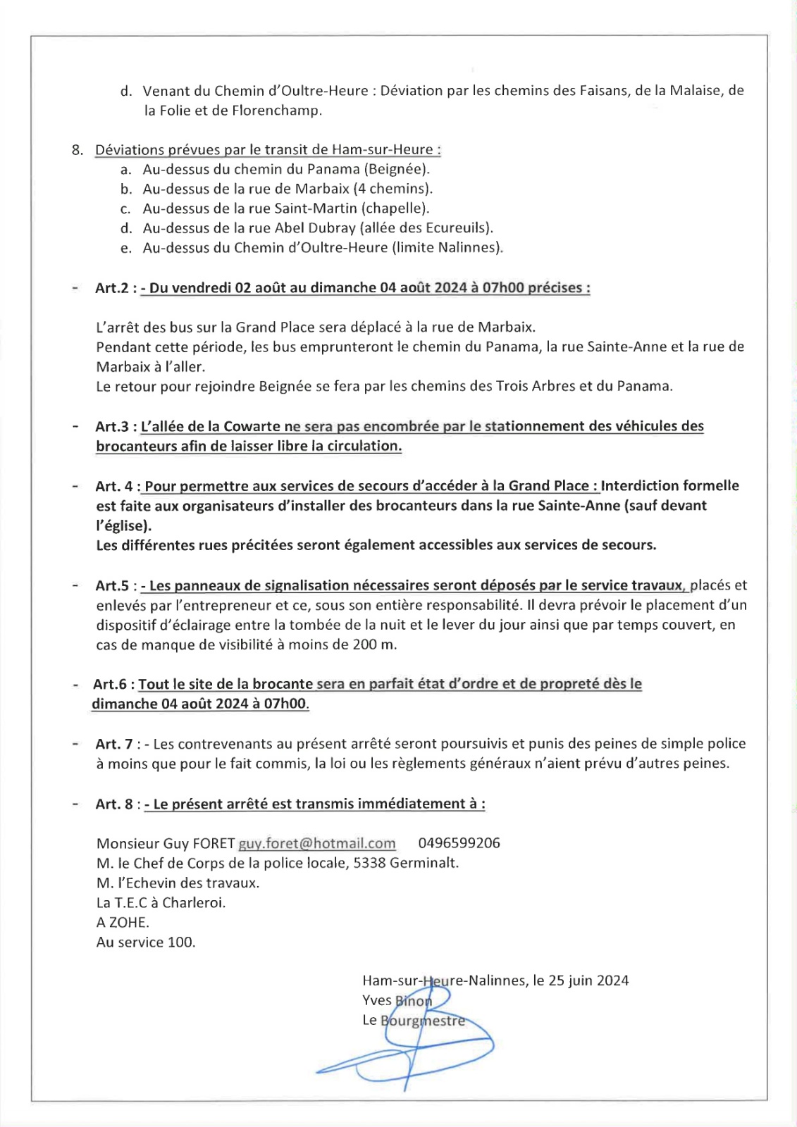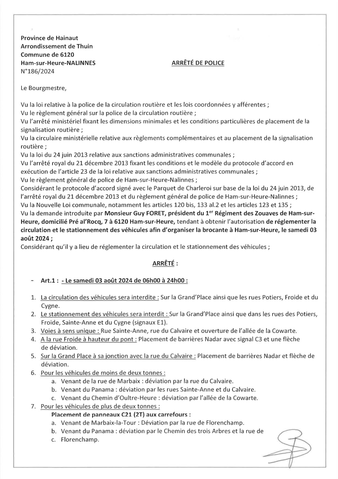 Arrêté de police relatif à la brocante des Zouaves de Ham-sur-Heure de ce samedi 3 août