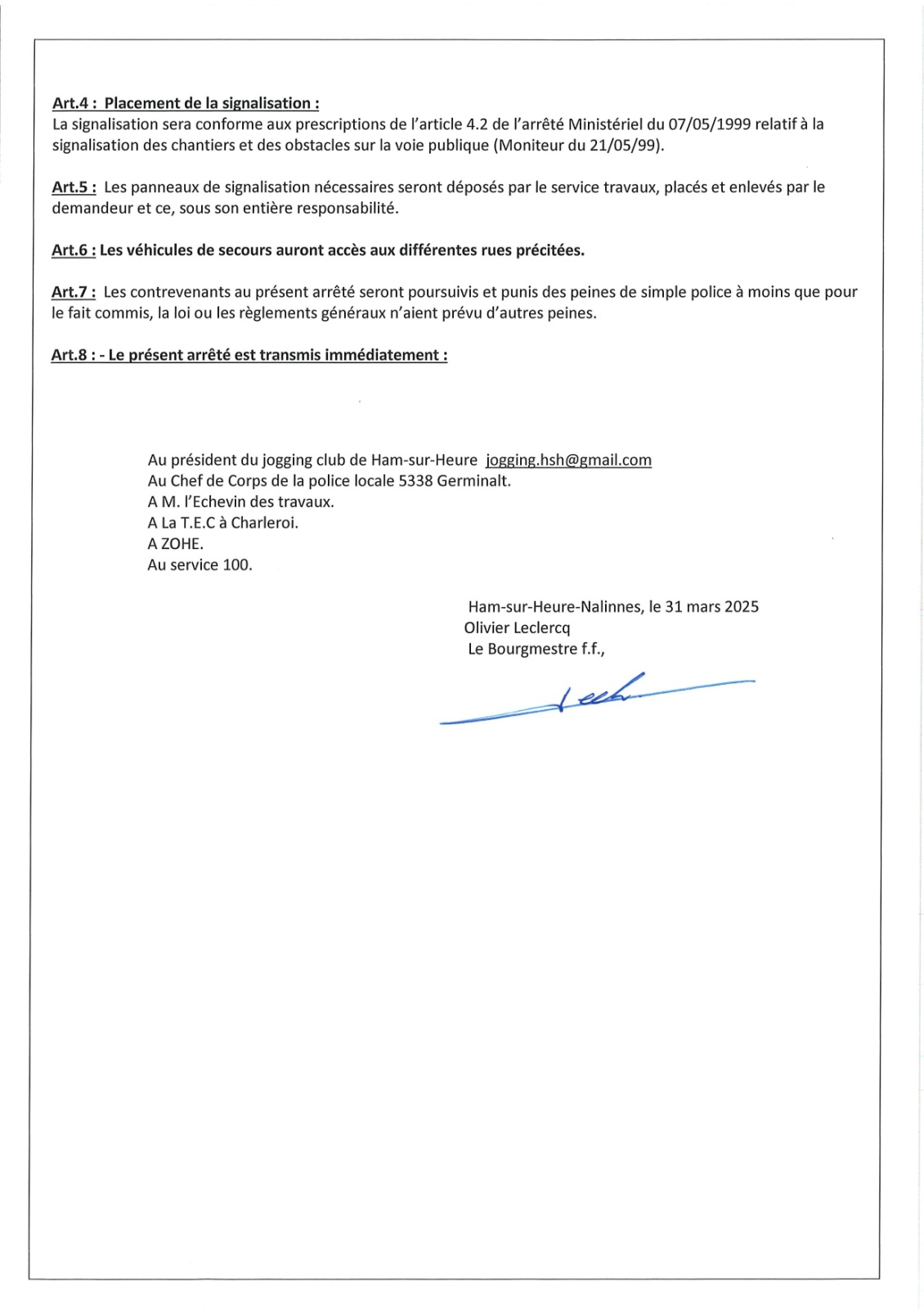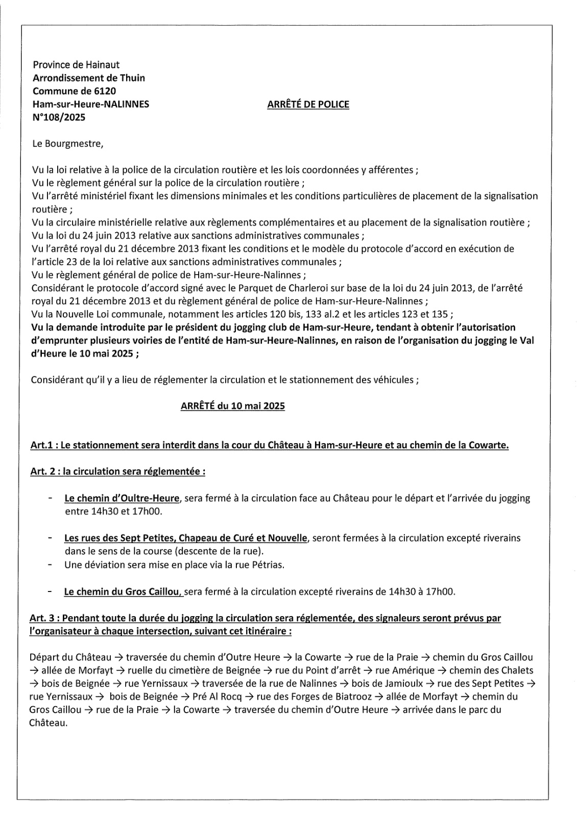 Arrêté de police relatif à la course du Val d'Heure ce samedi 10 mai à Ham-sur-Heure