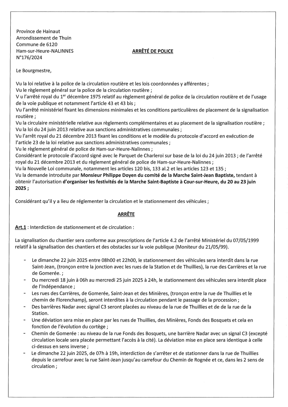 Arrêté de police relatif à la Marche Saint-Jean-Baptiste de Cour-sur-Heure