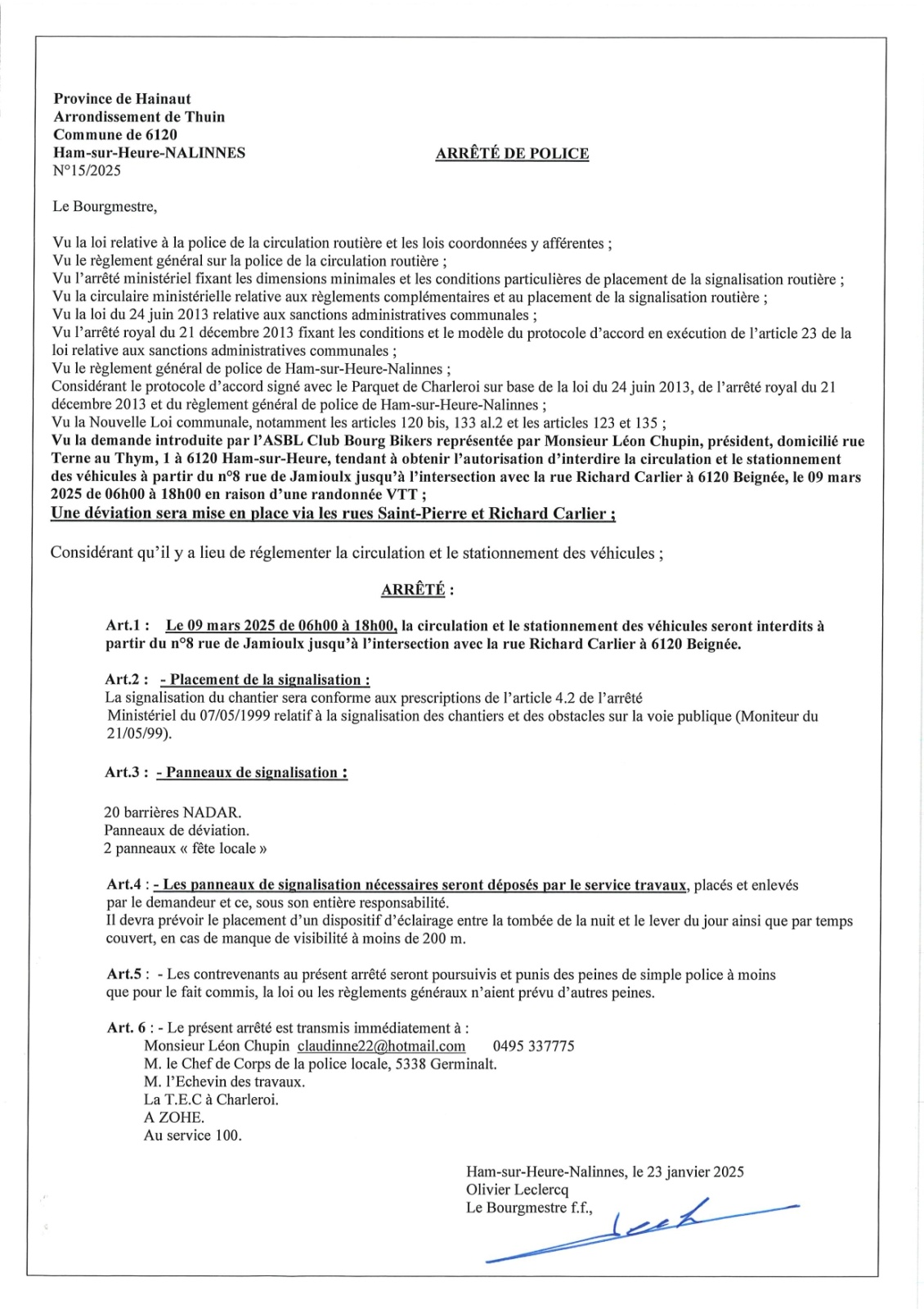 Arrêté de police relatif à la randonnée VTT des Bourg Bikers à Beignée ce dimanche 9 mars 2025