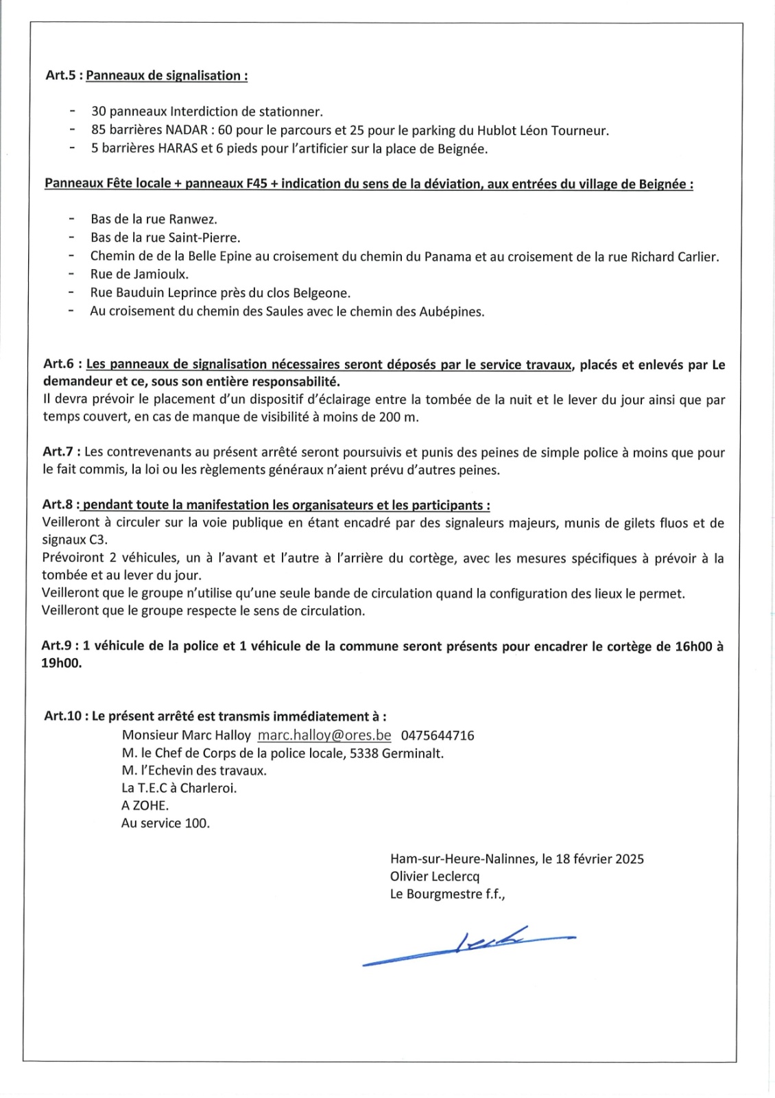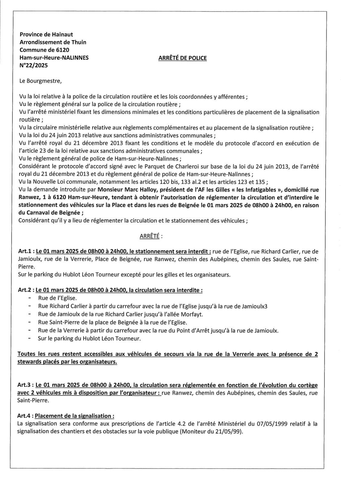 Arrêté de police relatif au Carnaval de Beignée de ce samedi 1er mars 2025