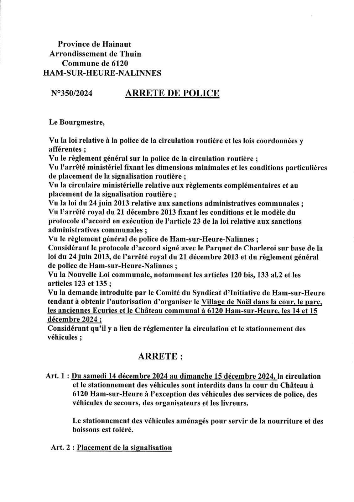 Arrêté de police relatif au Village de Noël de Ham-sur-Heure ces 14 et 15 décembre 2024