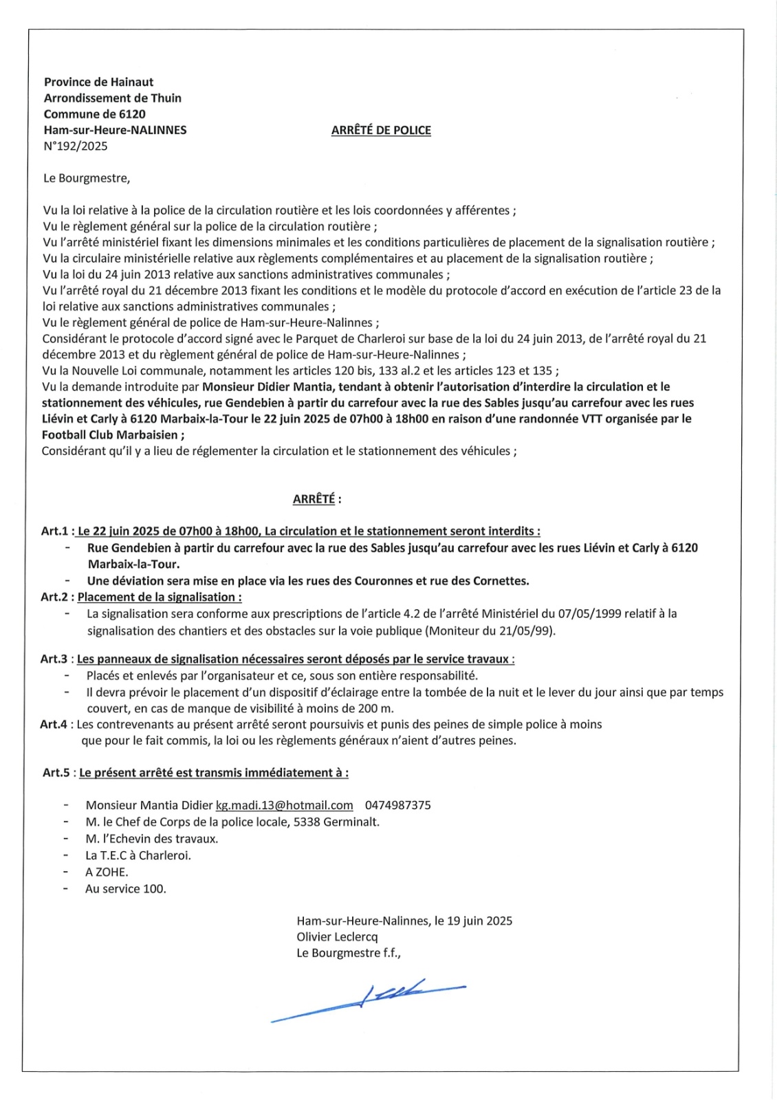 Arrêté de police relatif au VTT de Marbaix-la-Tour de ce dimanche 22 juin