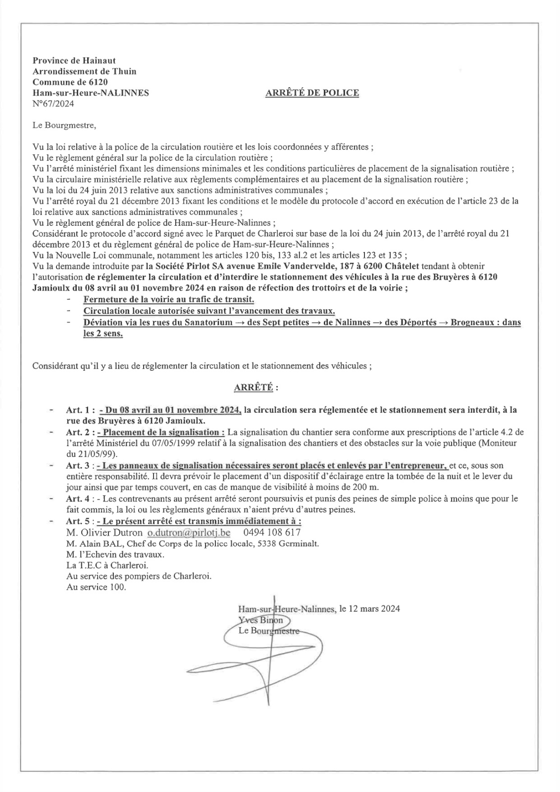 Arrêté de police relatif aux travaux de réfection de la voirie et des trottoirs à la rue des Bruyères à Jamioulx