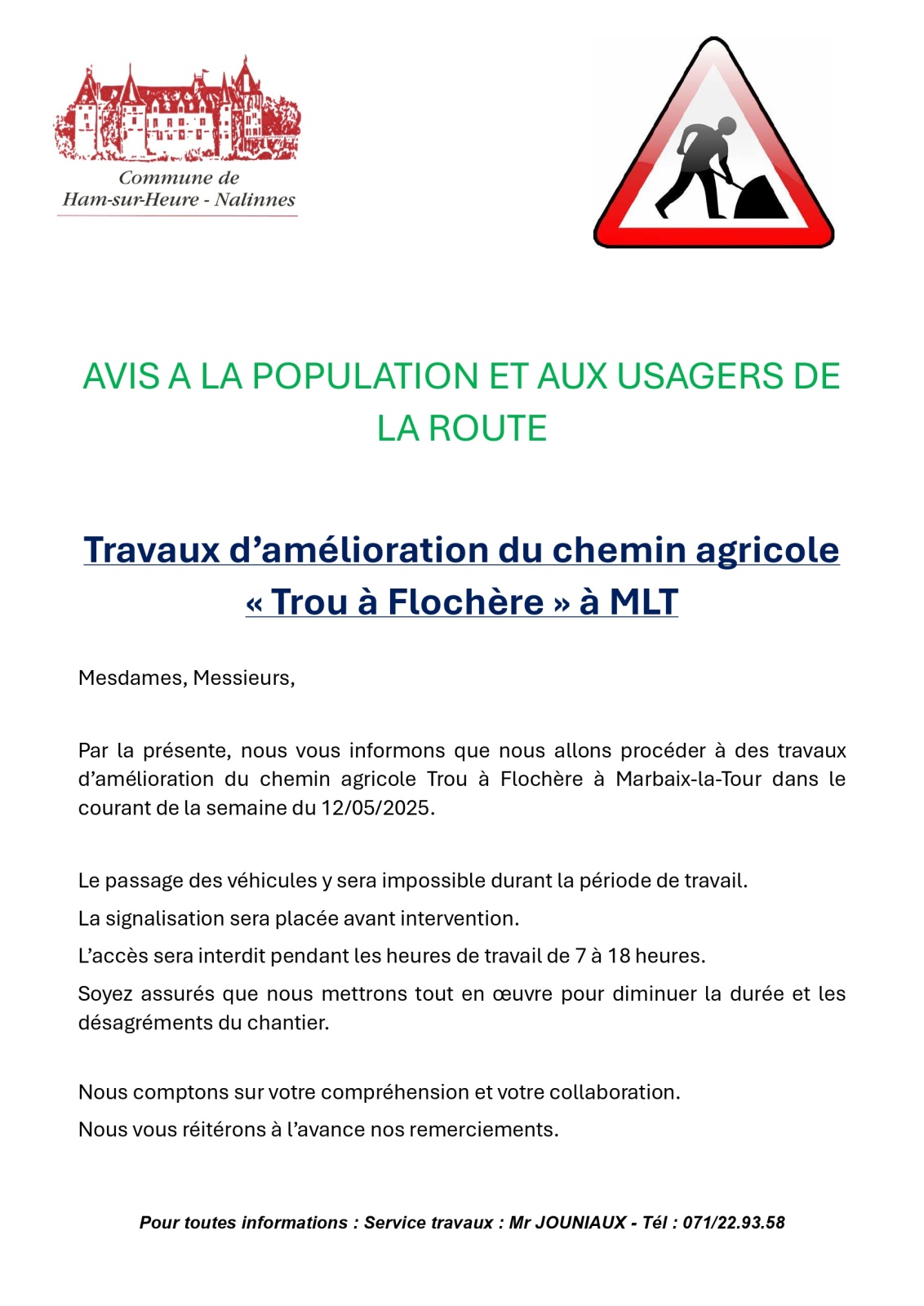Attention, dès le lundi 12 mai, un chantier débute au chemin Trou à Flochère à Marbaix-la-Tour