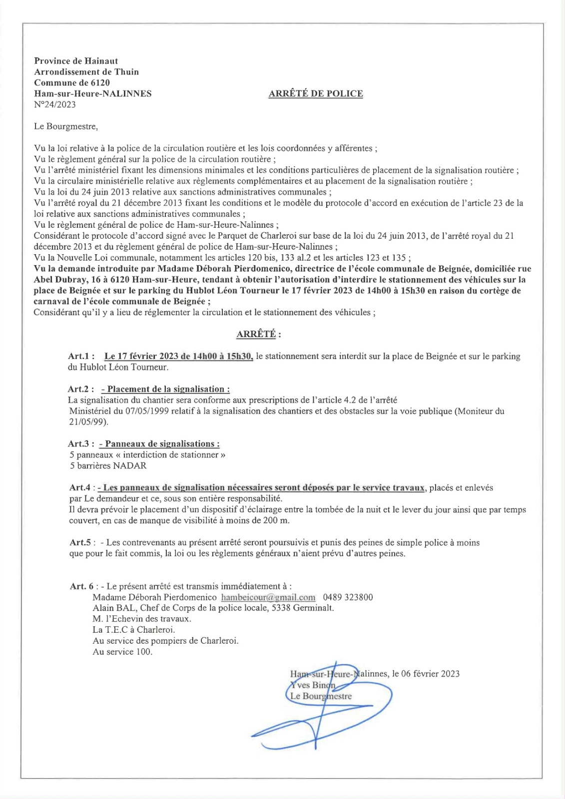 Carnaval des écoles de Beignée : stationnement interdit sur la place et sur le parking de la salle "Le Hublot Léon Tourneur" (17/02/23 de 14h à 15h30)
