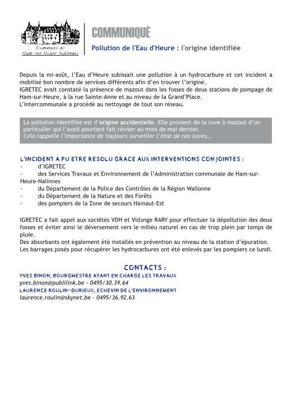 Communiqué : l'origine de la pollution de l'Eau d'Heure identifiée