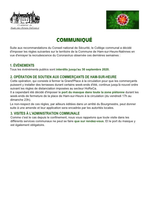 Communiqué : nouvelles mesures sur le territoire de Ham-sur-Heure-Nalinnes