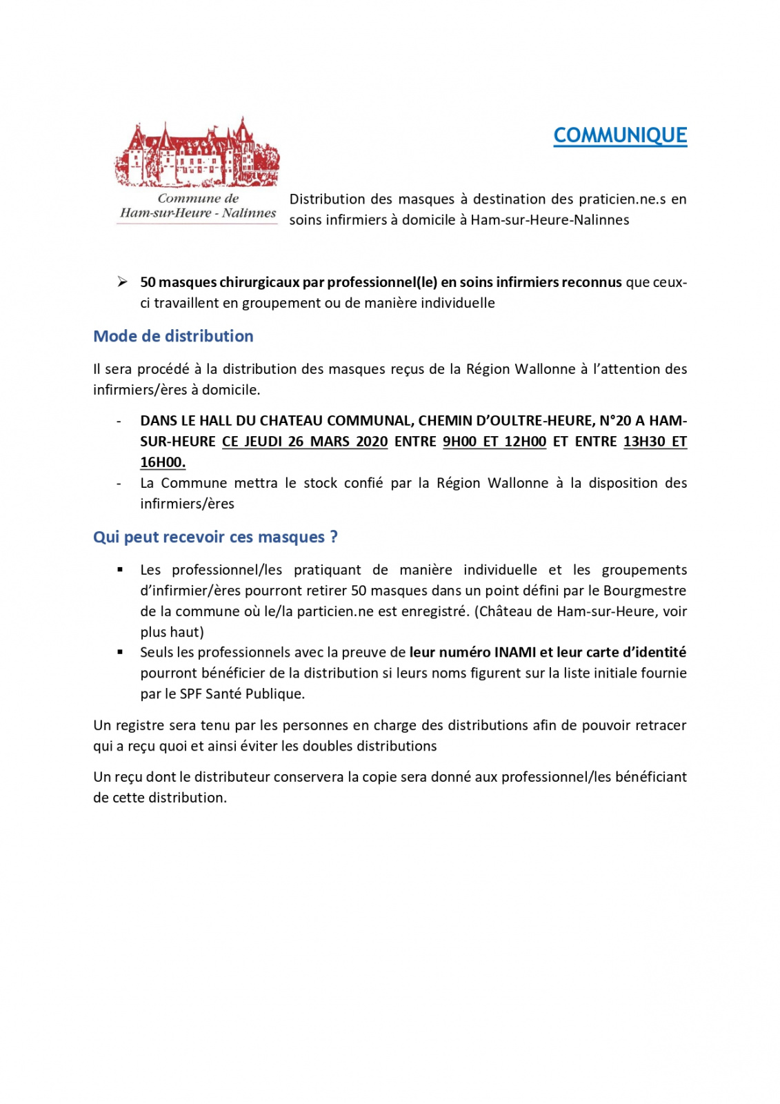 Distribution de masques aux praticien.ne.s en soins infirmiers à domicile enregistrés à Ham-sur-Heure-Nalinnes