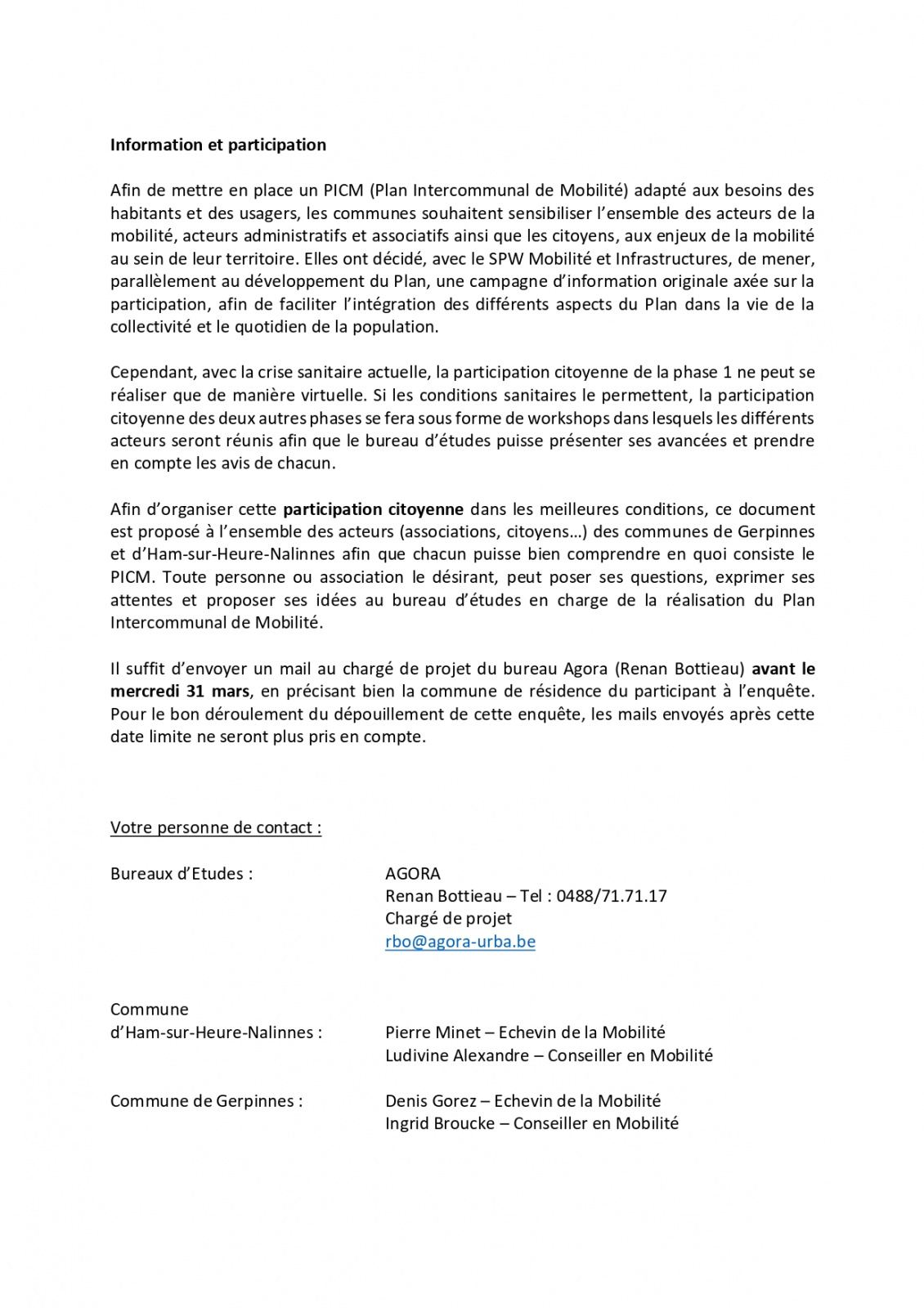 LANCEMENT DU PLAN INTERCOMMUNAL DE MOBILITE DE GERPINNES ET DE HAM-SUR-HEURE-NALINNES - Participation citoyenne