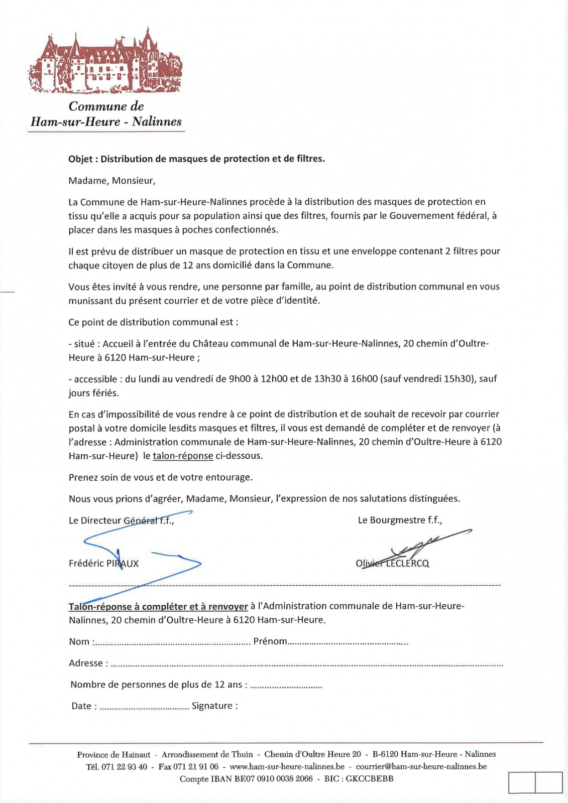 - Une personne par foyer se rend au Château de Ham-sur-Heure pour recevoir tous les masques de sa famille (1/personne de plus de 12 ans) ainsi que des filtres. Munissez-vous de votre carte d'identité.