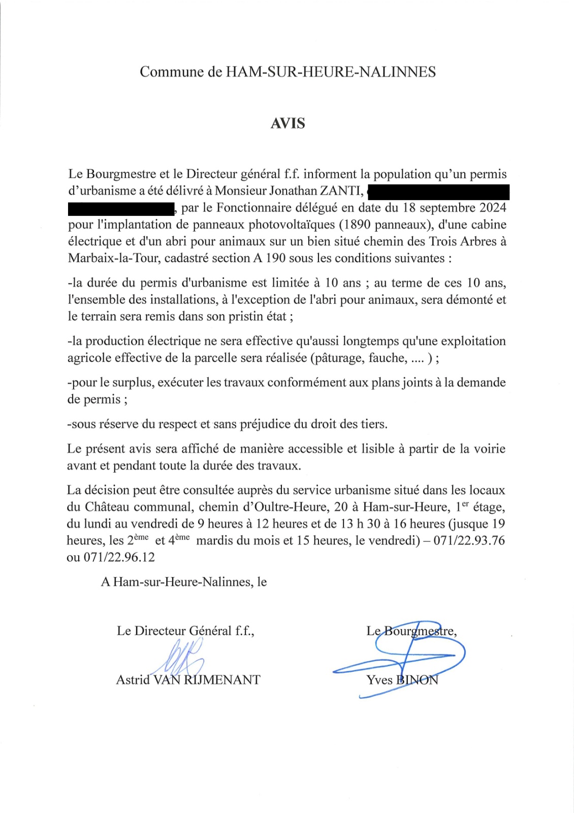 Octroi du permis d'urbanisme pour l'implantation de 1890 panneaux photovoltaïques au Chemin des Trois Arbres à Marbaix-la-Tour