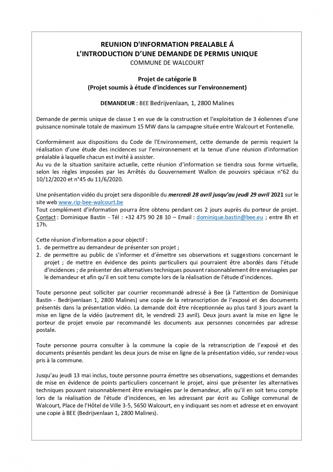 Voici l'invitation à une réunion d'information relative à la demande de permis unique de classe 1 en vue de la construction et l’exploitation de 3 éoliennes entre Walcourt et Fontenelle.