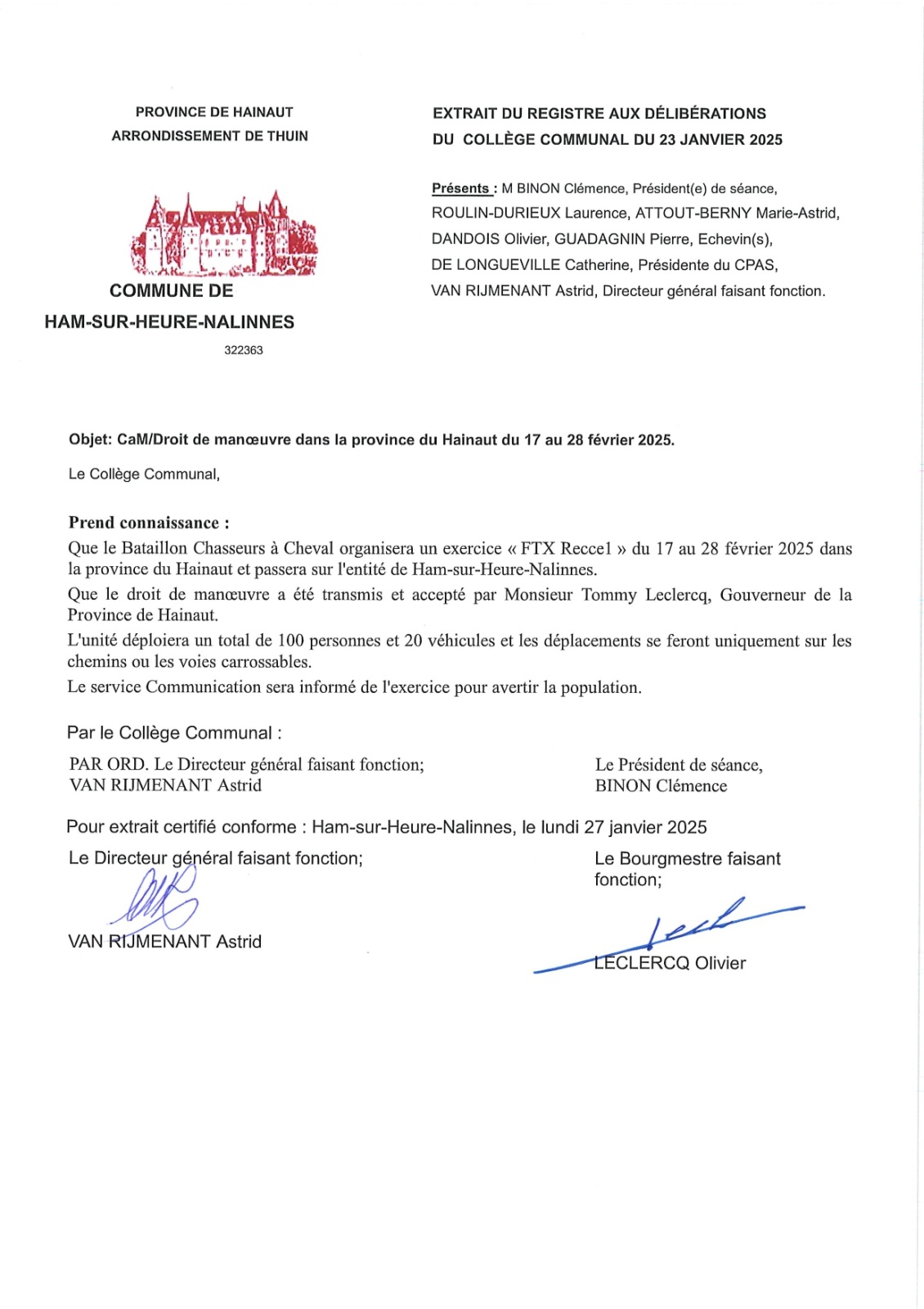 Le Bataillon des Chasseurs à Cheval sera en exercice. Veuillez prendre connaissance du document ci-dessous :