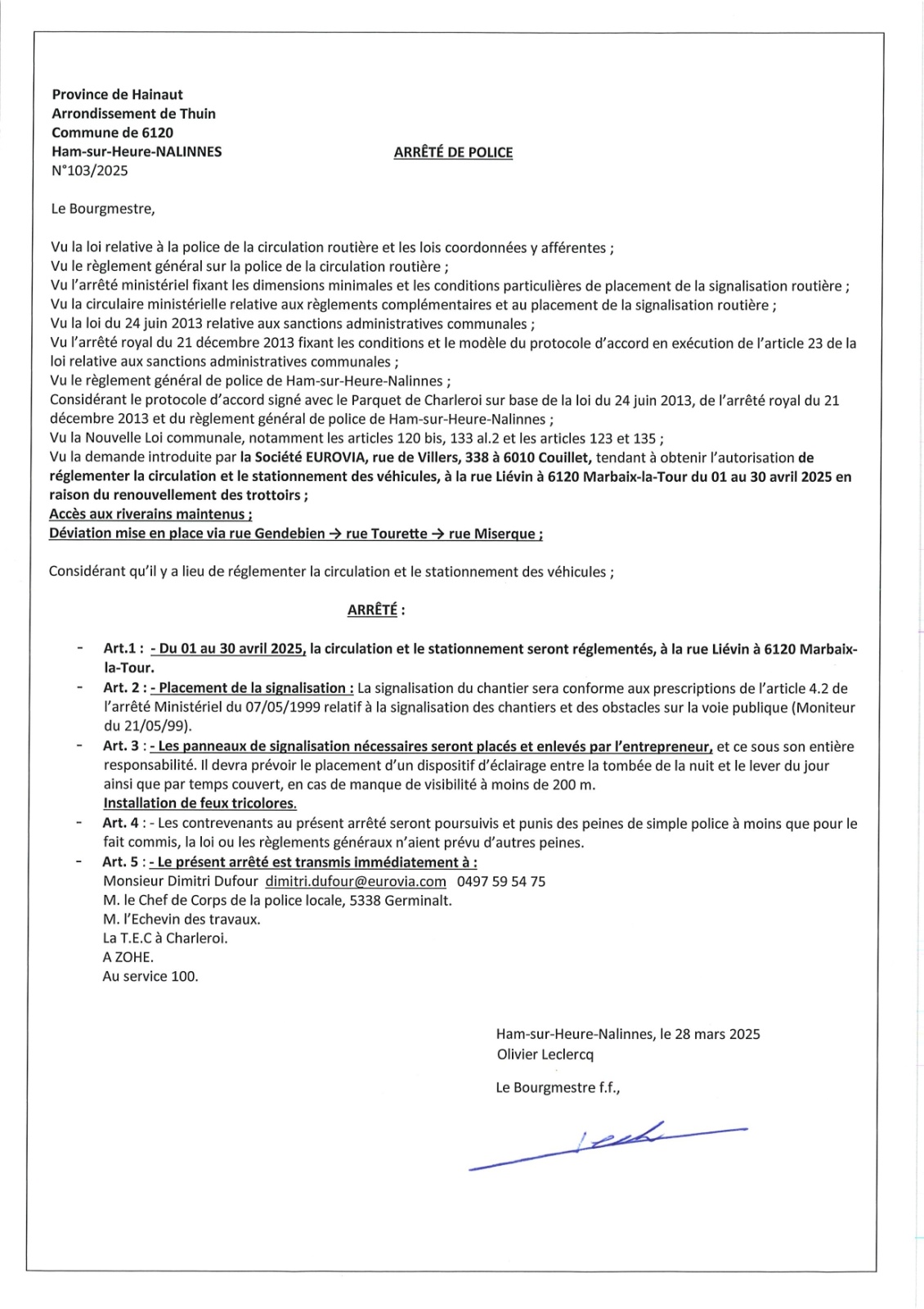 Arrêté de police relatif au chantier de renouvellement de trottoirs à Marbaix-la-Tour
