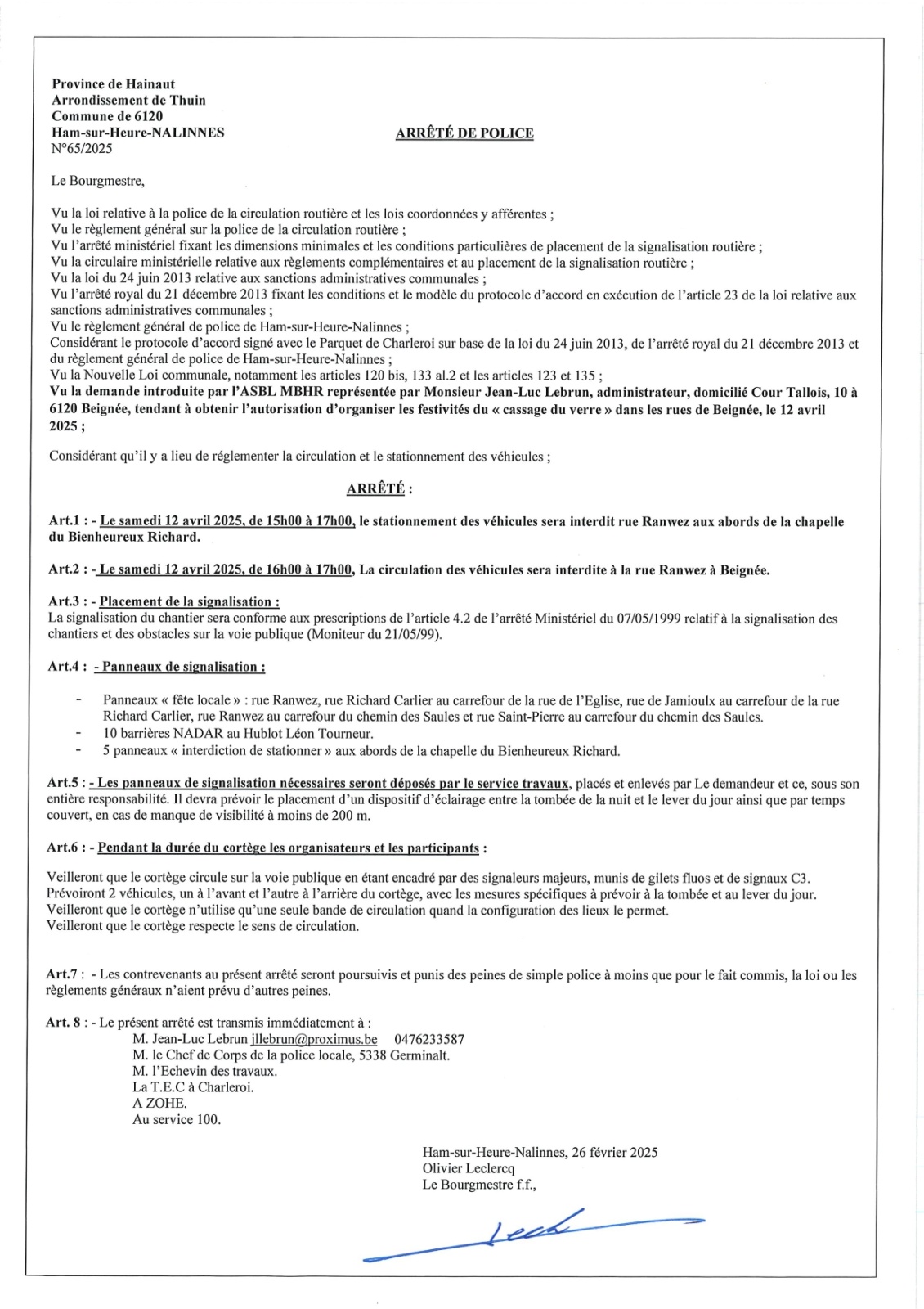 Arrêté de police relatif au Cassage du Verre de la Marche du Bienheureux Richard de Beignée ce samedi 12 avril 2025