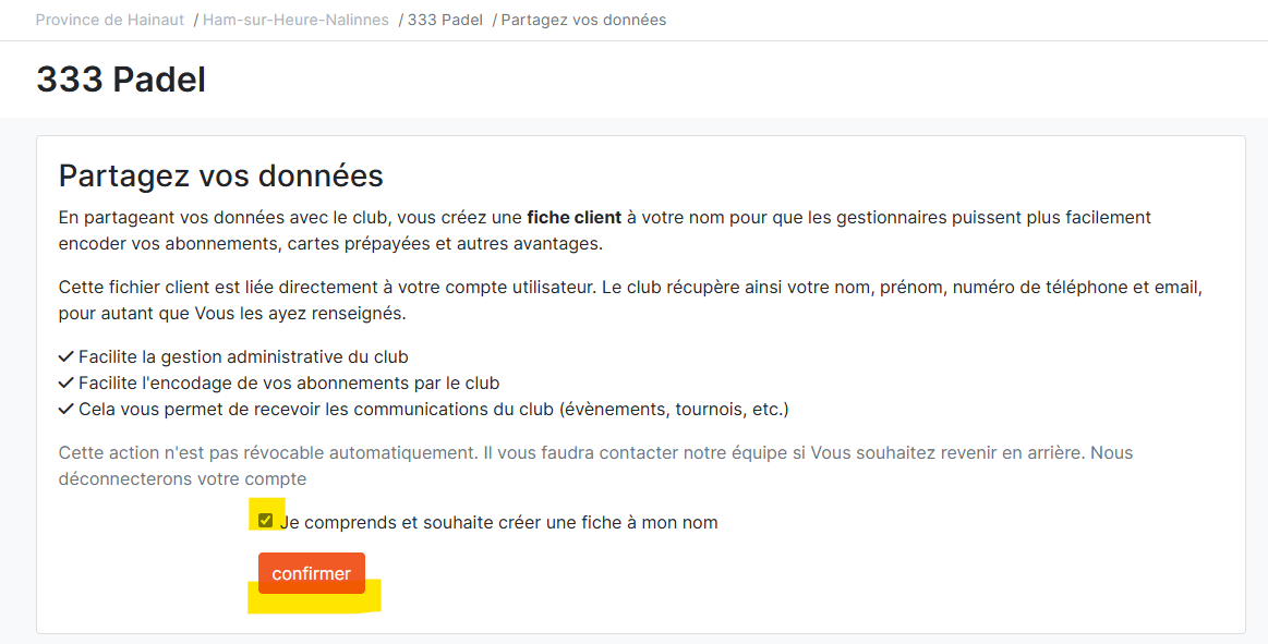 Une fois que vous avez cliqué sur "créer une fiche client", vous verrez l'écran ci-dessous. Cochez la case et confirmez.