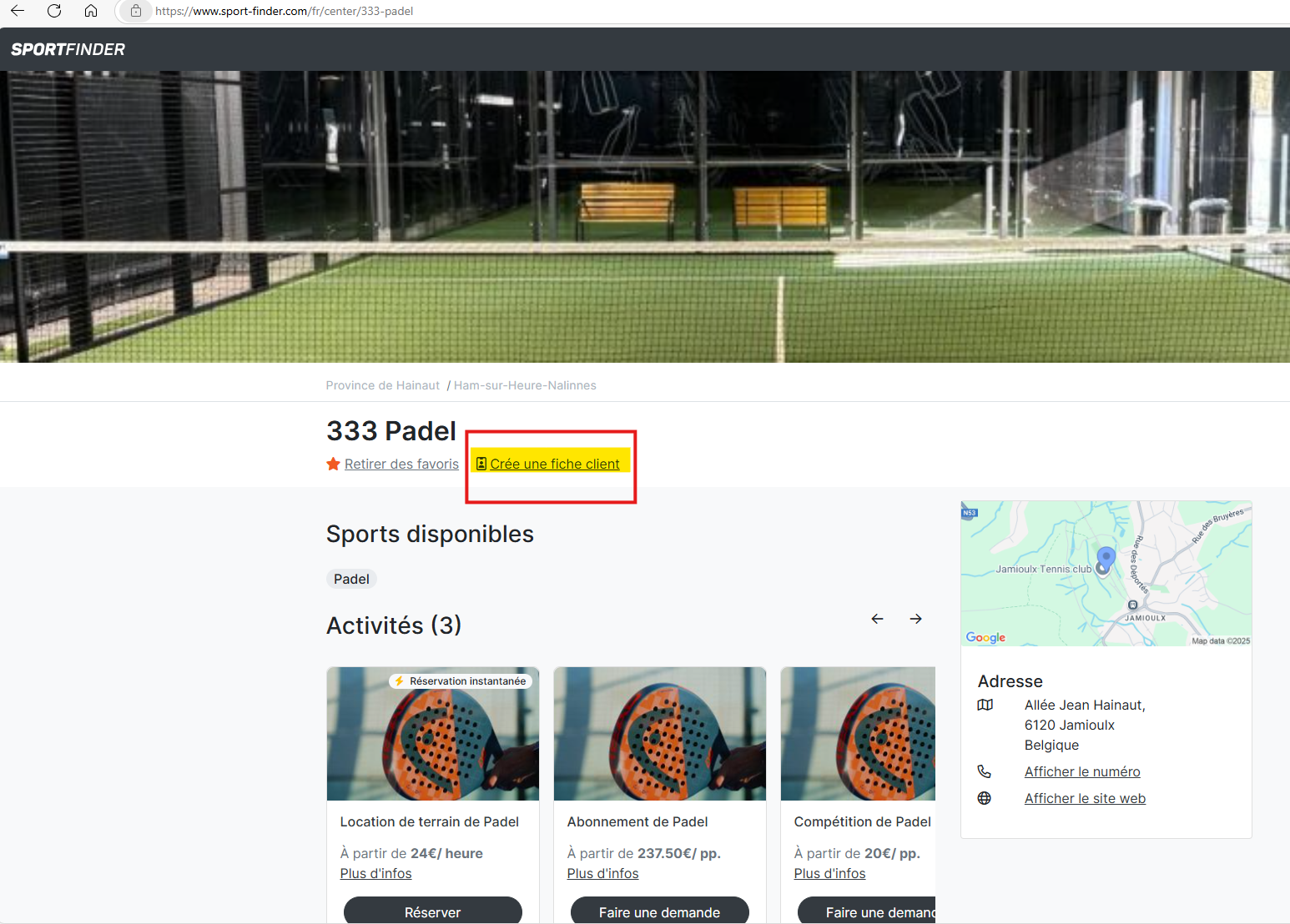 5.      Procédez à la réservation du T3 sur la plateforme Sportfinder en cliquant sur « Réservez – Location de terrain de Padel ».