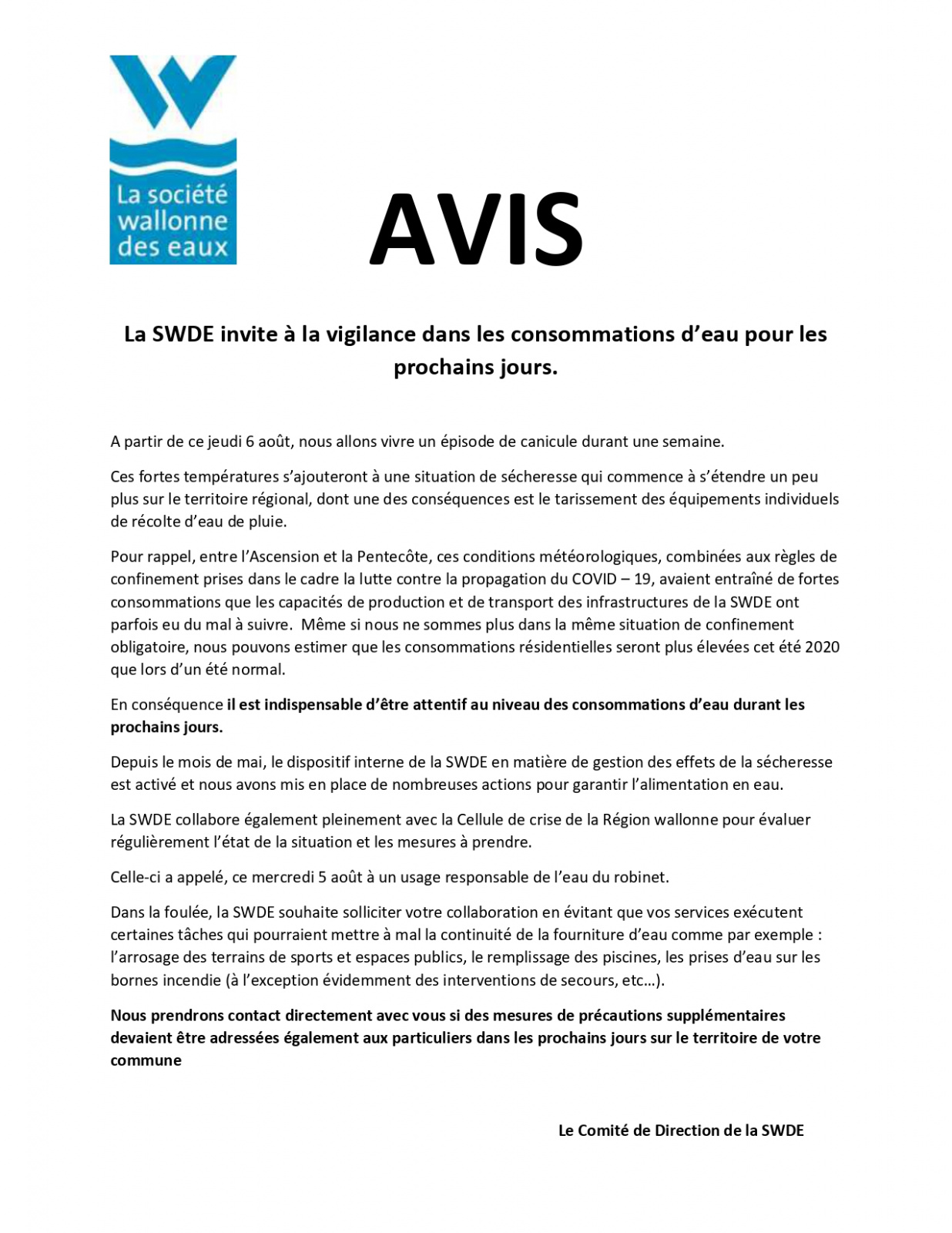 Veuillez prendre connaissance de l'avis suivant de la SWDE :