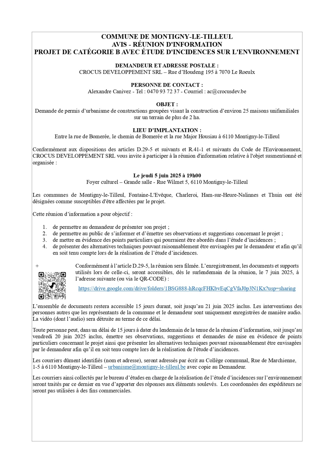 Cette réunion d'information se déroulera le jeudi 5 juin 2025 à 19h au Foyer culturel, rue Wilmet 5 à 6110 Montigny-le-Tilleul.