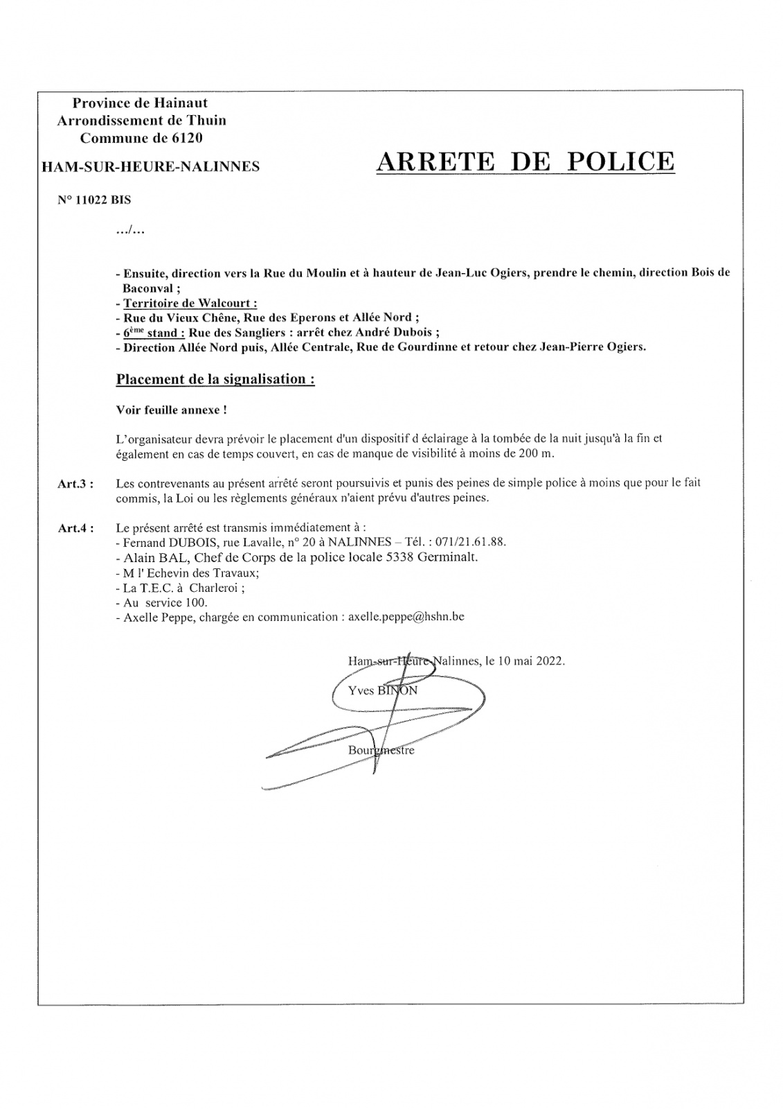 Arrêté de police concernant la marche apéritive de Nalinnes