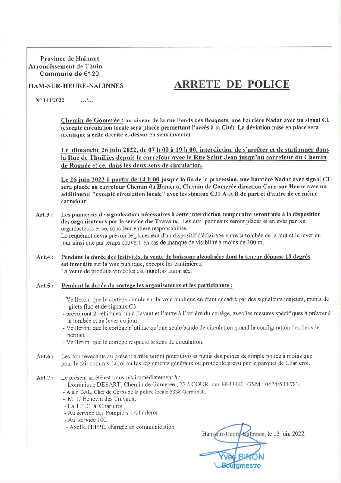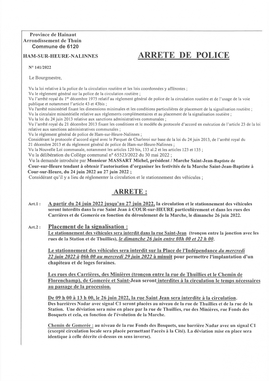 Arrêté de police concernant la Marche Saint-Jean-Baptiste de Cour-sur-Heure