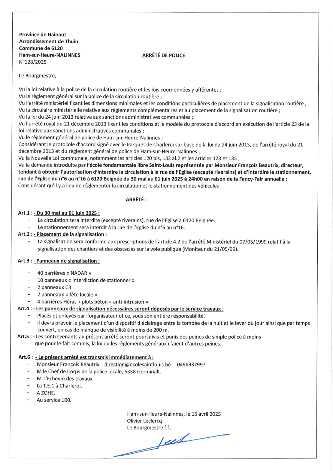 Arrêté de police relatif à la Fancy Fair de l'Ecole Saint-Louis de Beignée