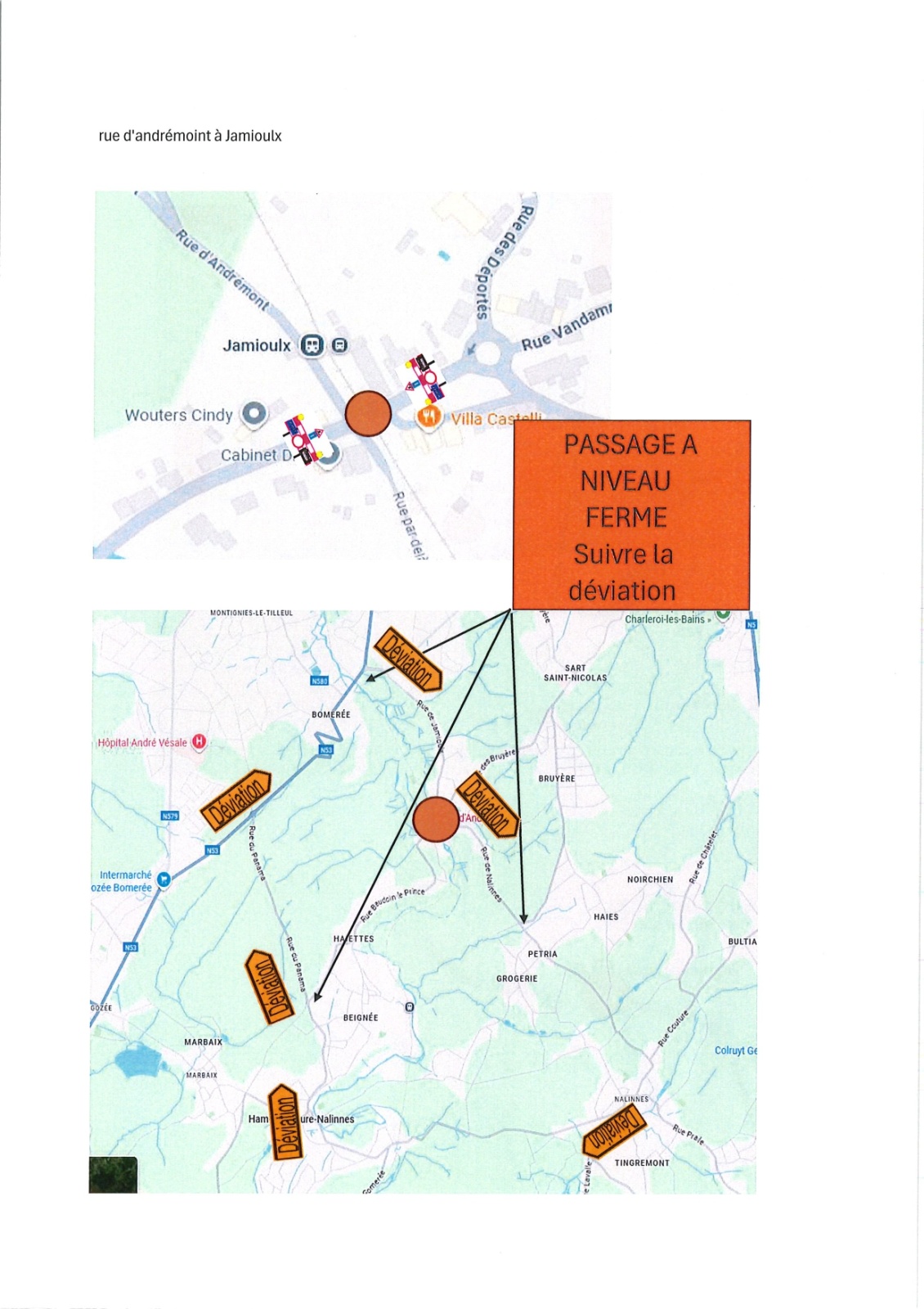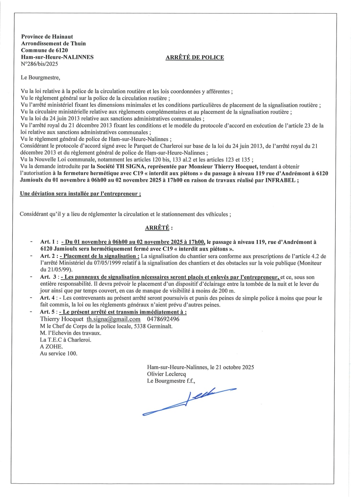 Arrêté de police relatif à la fermeture du passage à niveau de Jamioulx PN 119 du 1er (6h) au 2 novembre 2025 (17h)