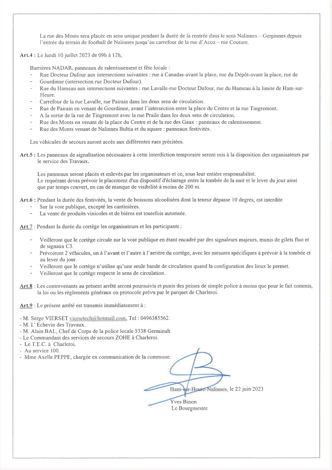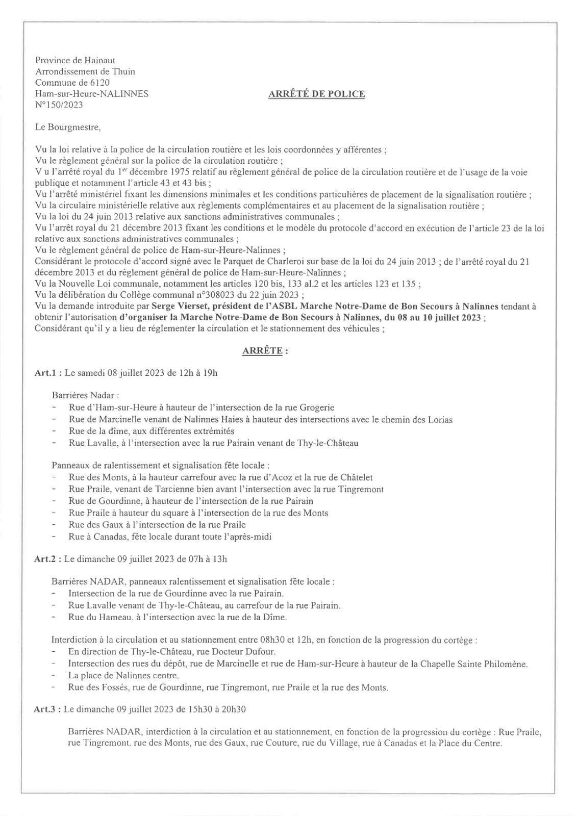Arrêté de police relatif à la Marche Notre-Dame de Bon Secours à Nalinnes du 8 au 10 juillet 2023