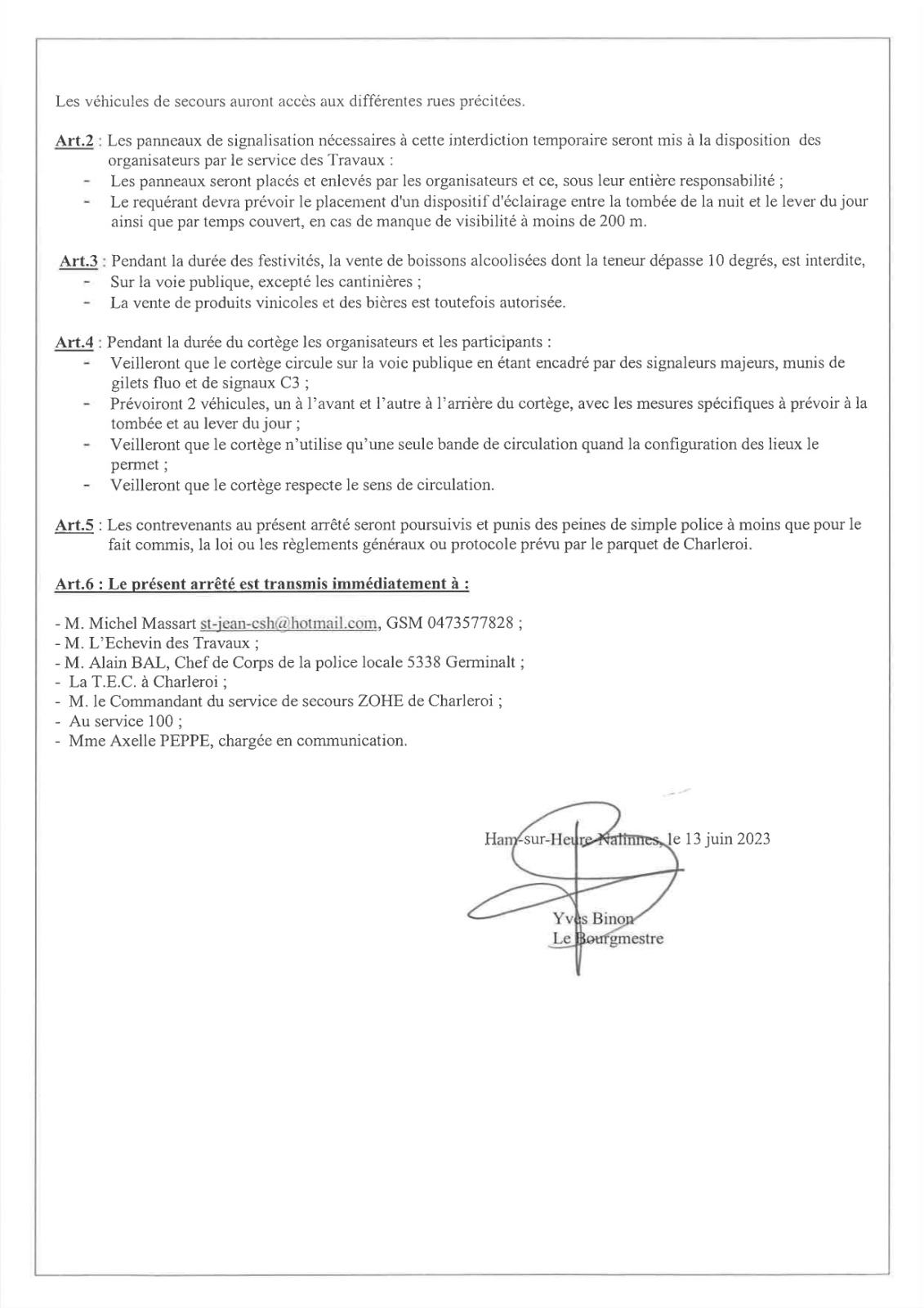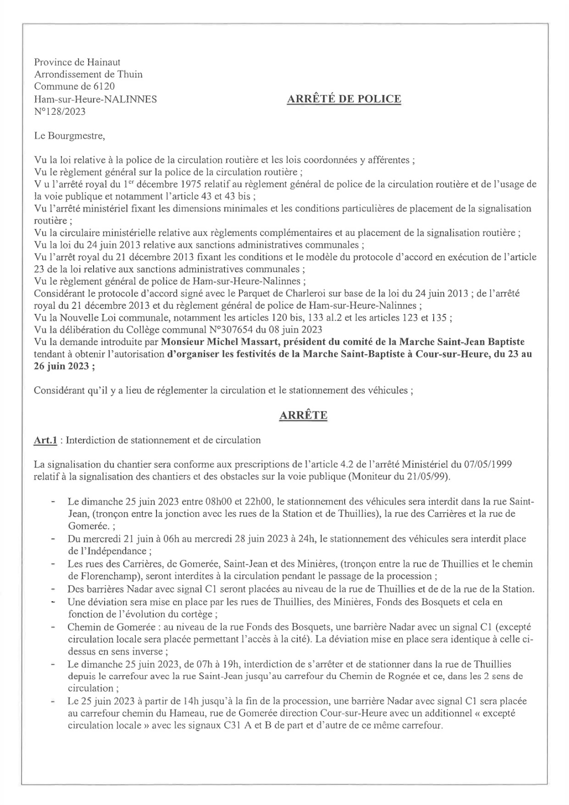 Arrêté de police relatif à la Marche Saint-Jean-Baptiste de Cour-sur-Heure