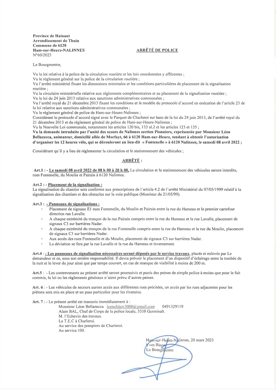 Arrêté de police relatif aux "12 heures vélo de Nalinnes"