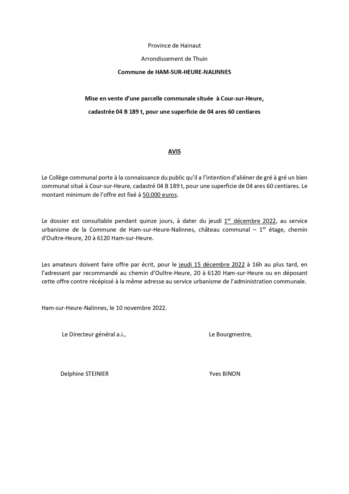 Avis de mise en vente d’une parcelle communale située à Cour-sur-Heure