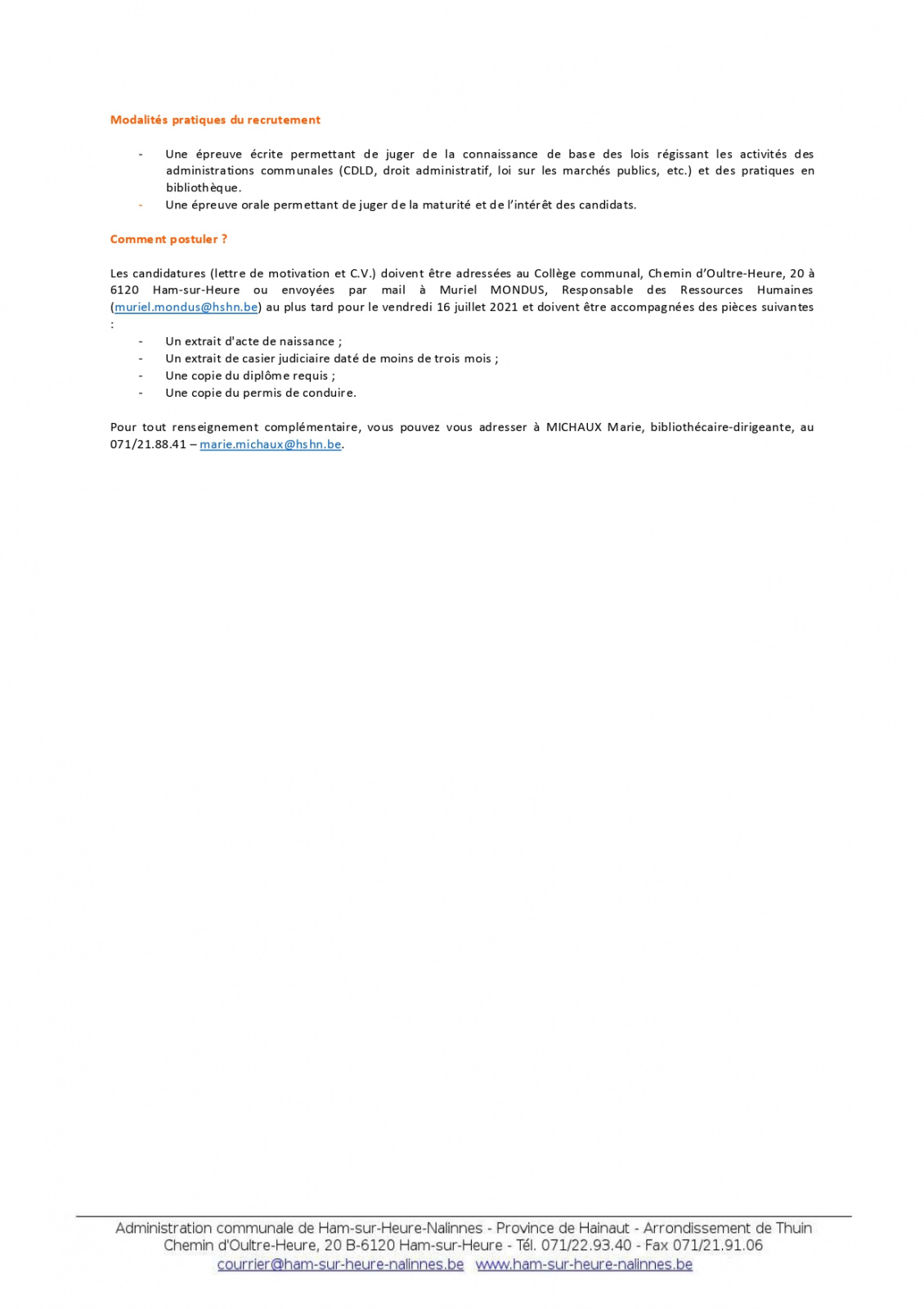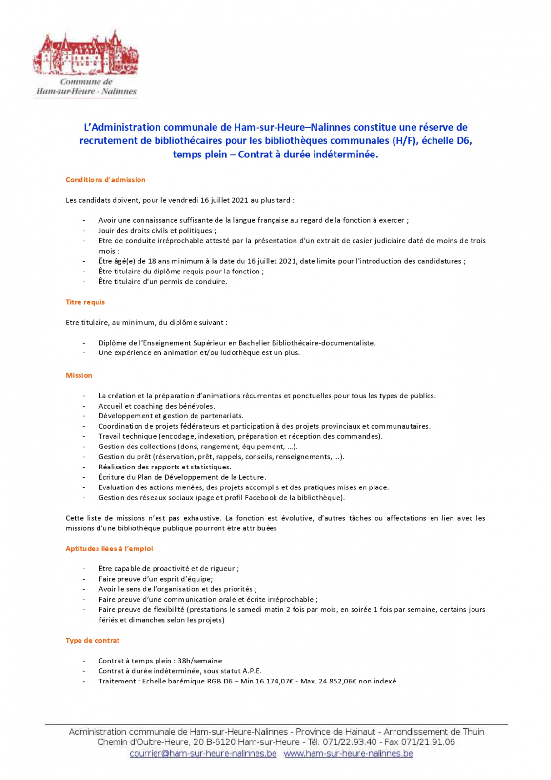 Voici l'annonce concernant le recrutement de bibliothécaires pour les bibliothèques communales (H/F), échelle D6, temps plein – Contrat à durée indéterminée.