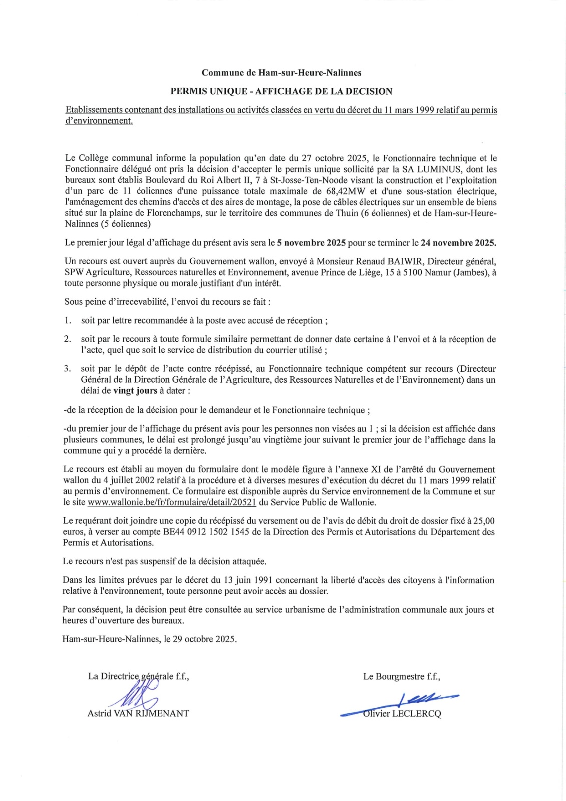 Décision relative à la demande de permis déposée par la SA Luminus visant la construction et l’exploitation d’un parc de 11 éoliennes sur la plaine de Florenchamp