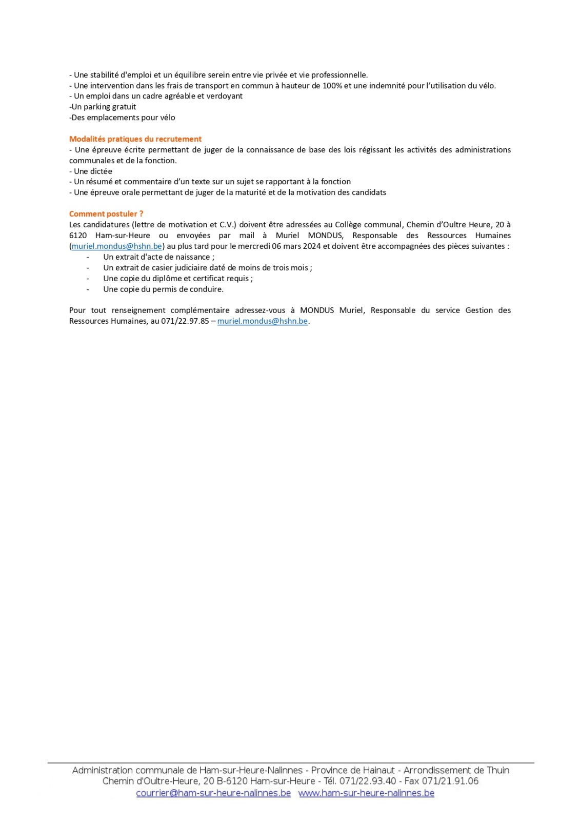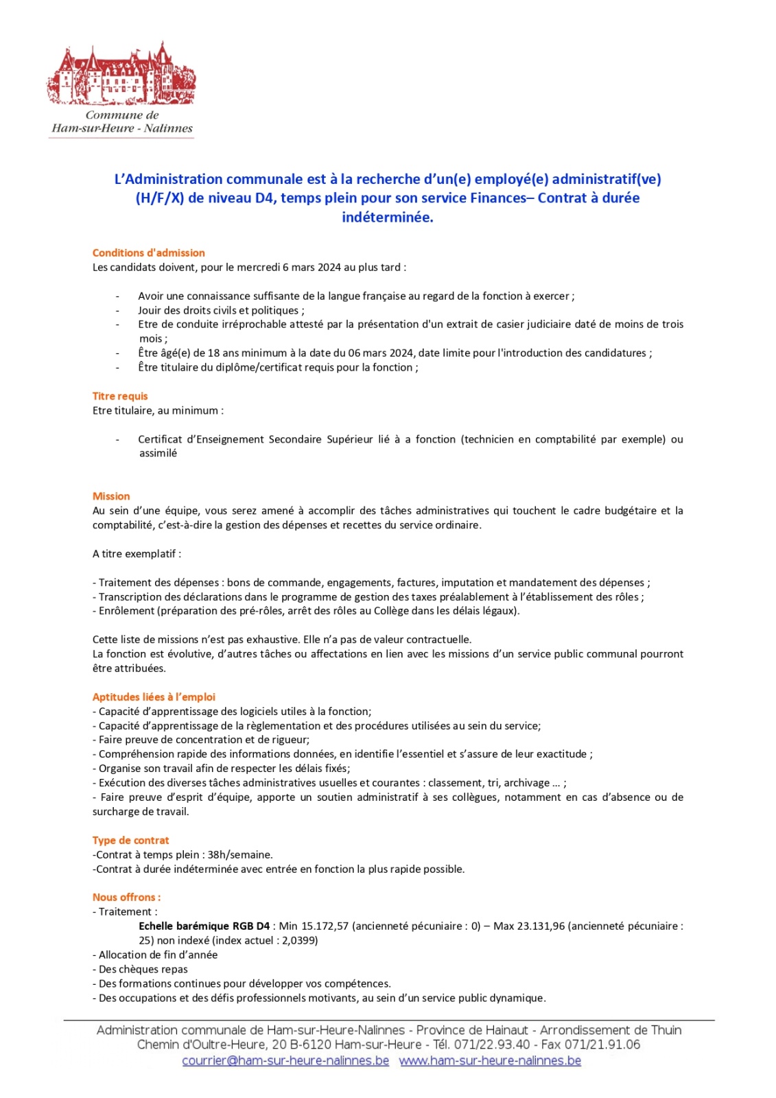 L'Administration communale de Ham-sur-Heure-Nalinnes engage un(e) employé(e) administratif(ve) pour son service Finances - Contrat à durée indéterminée