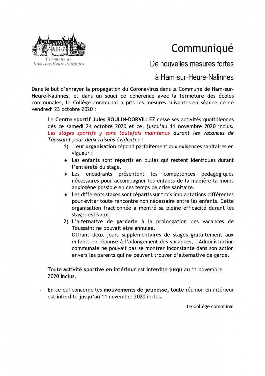Veuillez trouver ci-dessous les mesures prises ce jour par le Collège communal sur le territoire de Ham-sur-Heure-Nalinnes.